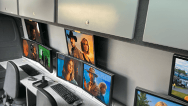 Three workstations with HD monitors