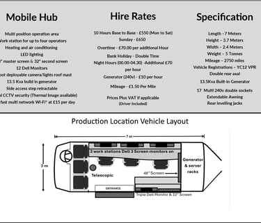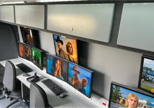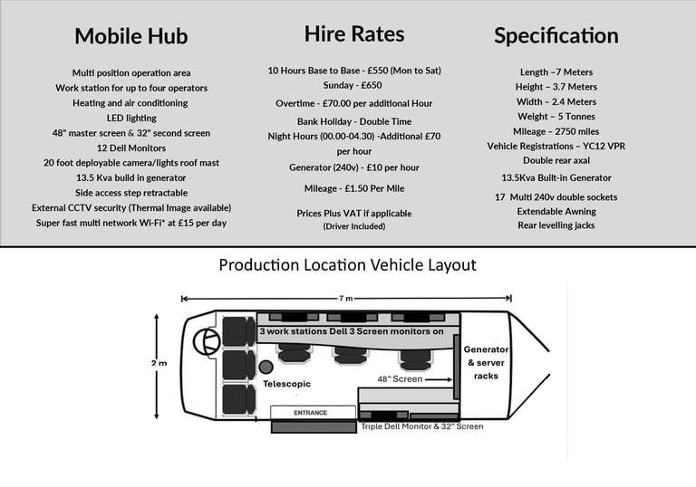 Our mobile film production vehicle is tailored for remote and dynamic locations. With three separate work stations providing ample space for crew members each with three Dell wall mounted HD monitors and Indi-go vision control desktops for precision operation, 17 fully functioning 240v double sockets, external power port, data port, and benefits from two rear levelling support jacks and double axel for stability. Our ‘Hub’ boasts a super-sleek multi purpose media hub, complete with server racks for recording in real-time, supporting drone operations with two wall mounted HD screens (48” and a 32” secondary screens), equipped with a 20 foot pneumatic telescopic mast for transmitting, cameras or lighting.